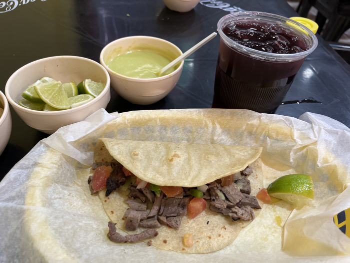 This image depicts a prepared meal displayed on a dark table in Minatitlán, Mexico. Central to the frame is a single taco resting on white parchment paper within a partially visible woven basket. The taco consists of a corn tortilla folded over a filling of sliced grilled meat (likely beef), diced red tomatoes, and finely diced white onions. To the upper left of the taco, a small, light-colored bowl contains several wedges of fresh lime. Adjacent to it, another small, light-colored bowl holds a light green, viscous sauce, possibly an avocado-based salsa or guacamole, with a white plastic spoon submerged within it. In the upper right portion of the image, a clear plastic cup with a ribbed side contains a dark purple beverage, consistent with a fruit-infused drink like "Jamaica." The drink contains small, dark, solid components, likely pieces of fruit or infused ice. A yellow plastic lid or cap is partially visible on the right edge of the cup opening. A small dark liquid spill is visible on the tabletop directly to the right of the cup's base. The table surface is dark, likely black, with a slight sheen indicating a smooth, possibly laminated or plastic, finish. Faint white lettering, potentially "Coca-Cola" branding, is discernible on the table surface in the upper left background. The overall background is dark and out of focus, suggesting an indoor dining environment. No individuals or active interactions are visible.