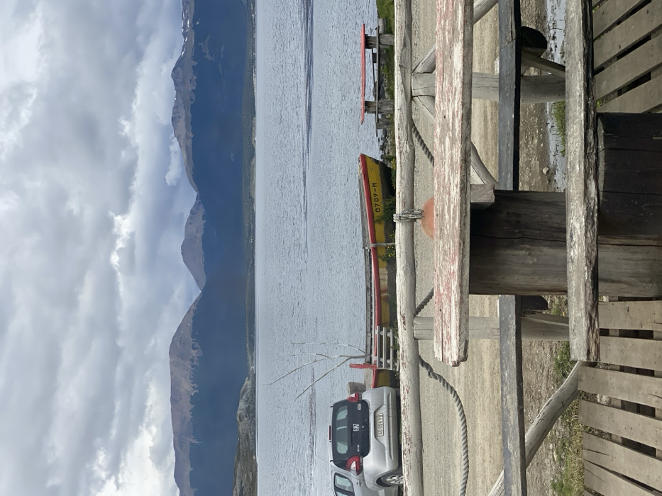 The image depicts a static, outdoor scene in Puerto Almanza, Argentina, presenting a view across a body of water toward distant mountains under an overcast sky. In the foreground, a rustic wooden fence and railing system spans the width of the frame. A weathered wooden picnic table with a faded red tabletop is positioned in the immediate foreground, partially obscured by the fence. A thick, dark rope is wrapped around a fence post, secured to an orange, spherical buoy hanging behind the top rail. The ground in the foreground is composed of dirt and gravel, with wooden planks visible at the very bottom. The middle ground features a shoreline with a silver compact hatchback car, identified as a Fiat with license plate "AD 094 PB," parked on the dirt. To its right, a weathered wooden boat, painted yellow on the hull and red on the gunwales, rests on the shore. The numbers "0709-H" are visible in white on the boat's side. Wooden steps lead up to the boat. A cluster of bare, pale branches stands vertically near the boat. Further to the right along the shoreline, two additional rustic wooden picnic tables with benches, featuring faded red tops, are situated on a patch of sparse green grass. The background consists of a wide expanse of calm, grey-blue water. Beyond the water, a range of large mountains with varying peak formations rises, their lower slopes covered in dark, dense vegetation, contrasting with lighter, rockier upper sections. The sky above is entirely overcast with a dense layer of grey and white clouds. No people or active interactions are observed in the scene.