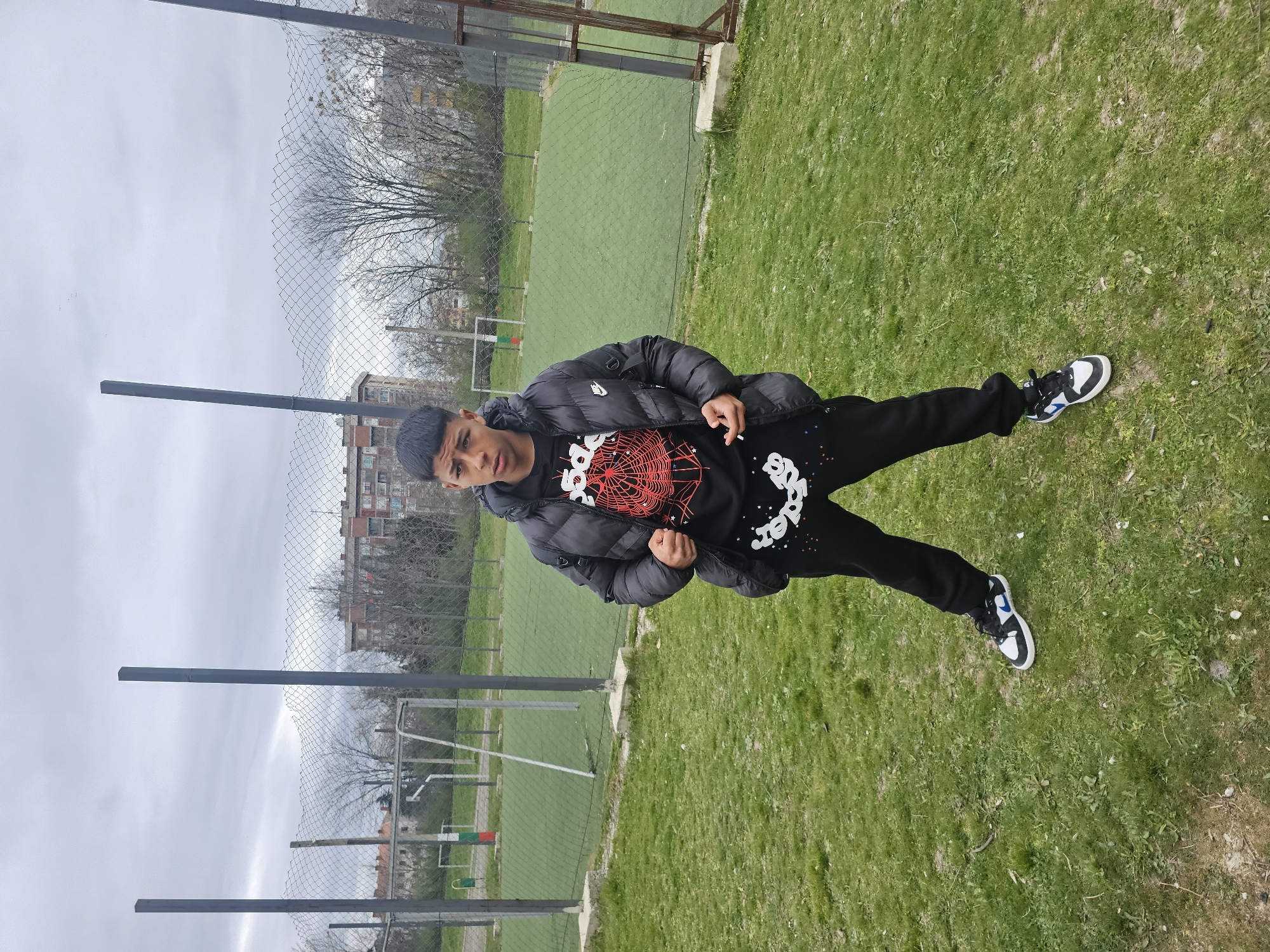 A young male stands centrally on a patch of natural grass, facing the camera directly. He wears a black puffer jacket with a Nike logo, a black long-sleeved shirt featuring a prominent red spiderweb graphic, black sweatpants with white lettering, and black, white, and blue athletic shoes. His right hand holds a small white object, possibly a cigarette, between his index and middle fingers. Behind him, a chain-link fence separates the grassy area from an artificial turf football pitch. A goalpost painted in the white, green, and red colors of the Bulgarian flag is visible on the left side of the pitch. The background includes bare deciduous trees and multi-story residential buildings under an overcast, grey sky. The scene is consistent with an urban sports ground or park in Stara Zagora, Bulgaria.