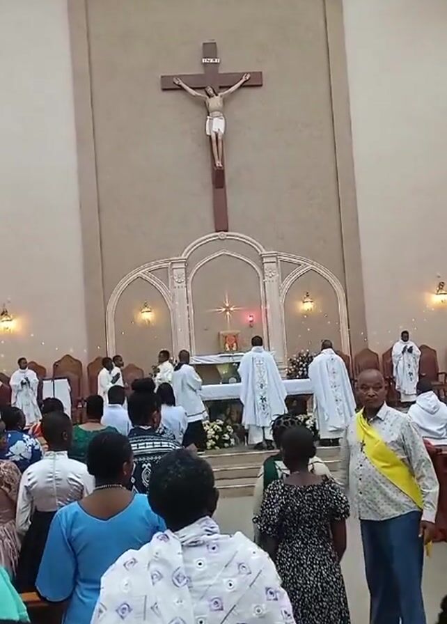 interior of a church. Several priests in white robes stand around an altar, performing a religious ceremony. A large crucifix hangs on the wall behind them. A congregation faces the altar, observing the ceremony. Most of the congregants have their backs to the camera. The environment is clean and well-lit.
