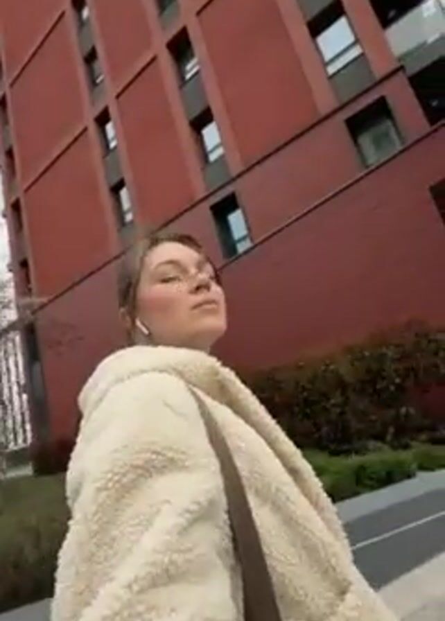A young woman is walking along a sidewalk in front of a tall, modern building with a reddish-brown facade. She is wearing a cream-colored, shaggy coat and has a bag slung over her shoulder. Her hair is pulled back into a ponytail and she is wearing white wireless earbuds. She is looking up at the building as she walks. The sky is overcast and there are trees and greenery visible in the background. The camera appears to be held low and is tilted upwards, giving a dynamic perspective.