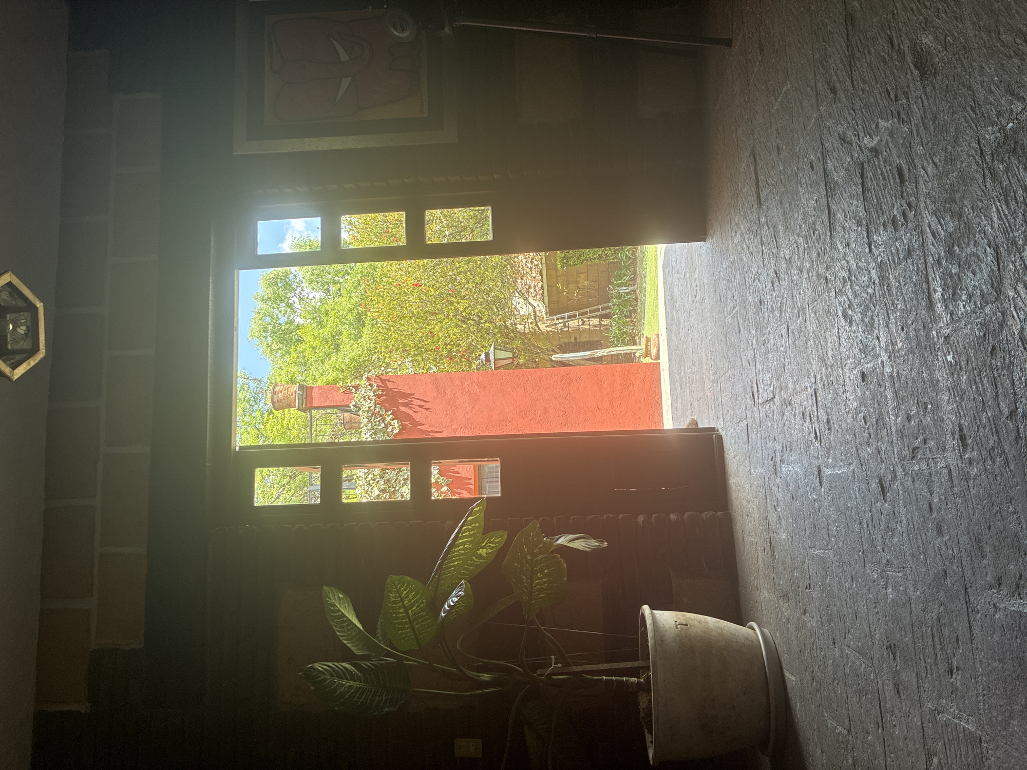 An interior view of a building in Cañada de Madero, Mexico. The image is taken from inside, looking out through an open doorway. Outside, there is a vibrant garden, featuring an orange wall, greenery, and other architectural elements. A potted plant sits inside near the doorway. The interior has textured walls, possibly made of stone or brick. The flooring appears to be a dark material, potentially stone. The framing of the doorway has a pattern of small, rectangular openings above the main entry. A picture hangs on the wall to the left.