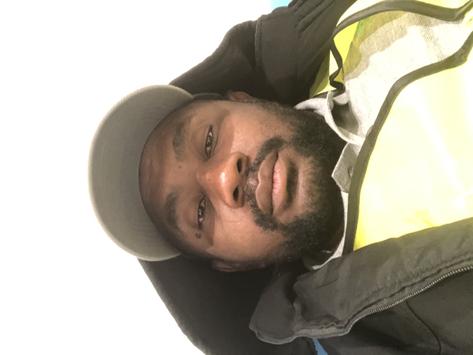 A man with a beard and wearing a gray baseball cap looks directly at the camera. He is also wearing a black jacket and a yellow high-visibility vest. His head is slightly tilted to the side. The background is primarily bright white on the left. The lighting is flat.