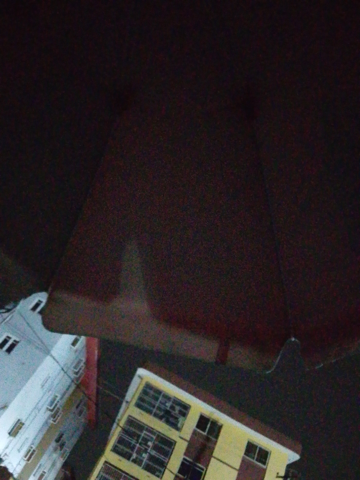 At night, an umbrella's underside fills most of the frame, its dark reddish-brown color dominating. Below, at an angle, two buildings are visible. One is light gray, the other, a yellow-beige with visible window patterns. A red pipe or structure partially connects the two buildings. The overall scene is dark, with the buildings illuminated by artificial light, suggesting a nighttime cityscape.