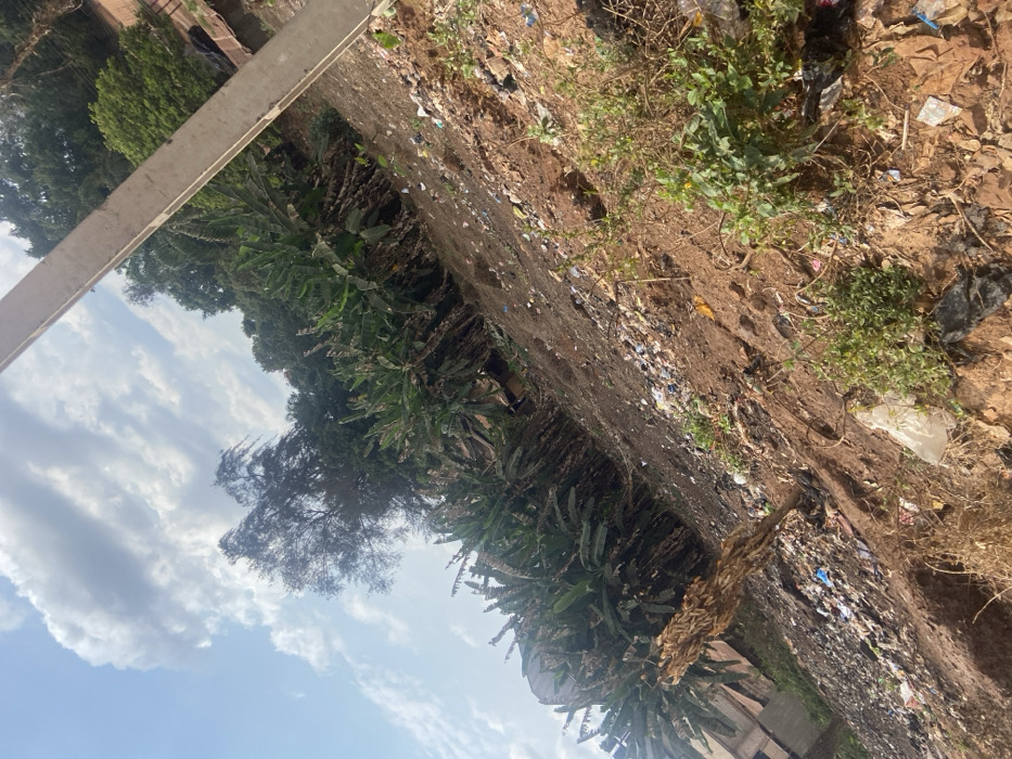 The scene depicts an outdoor area within Nsukka, Nigeria, under a bright, partly cloudy sky. The terrain consists of sloping, reddish-brown soil heavily contaminated with scattered refuse, including plastic bags, bottles, and various discarded materials. A dense row of mature banana plants forms a prominent barrier in the mid-ground, situated before a backdrop of taller, denser foliage. In the immediate foreground, sparse green and desiccated brown vegetation grows amidst the debris, with a prominent dead or dying tree trunk featuring dry leaves. A light-colored utility pole stands vertically along the right frame, and a section of a building is visible in the far left background. No human subjects or active events are depicted.
