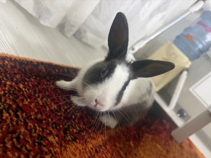 A small domestic rabbit is positioned centrally in an indoor environment within Stara Zagora, Bulgaria. The rabbit presents a bicolored fur pattern, predominantly white with distinct black markings on its erect ears, around its eyes, and extending over parts of its back. Its muzzle is white with a visible pink nose and numerous long, white whiskers emanating outwards. The animal is captured from a slightly elevated, frontal perspective, looking directly towards the observer. It rests on a textured rug displaying a mottled pattern of orange, red, and black. In the background, to the left, a light-colored floor or wall surface is visible. To the right, a white furniture piece, possibly a shelf or cabinet, is partially present. Behind the furniture, a large, translucent blue plastic water bottle is discernible, accompanied by a pale yellow rectangular object and a horizontal white rod. A small, dark electronic device with a faint blue indicator light is situated in the lower right background.