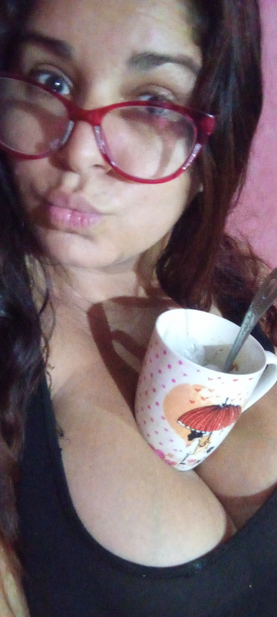 A woman with brown hair and red-framed glasses is holding a white mug with pink polka dots and a heart design, which features a figure under a red umbrella, in her left arm. The mug contains a spoon and appears to hold a beverage. She is wearing a black tank top. The background is a blurry pink hue. The setting appears to be indoors. The city is Unknown, Unknown.