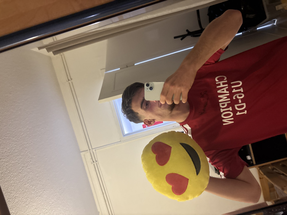 A person, reflected in a mirror, holds a phone taking a picture of themself. They wear a red t-shirt with backwards writing. The person's face is partially obscured by the phone. In the other hand they hold a yellow emoji pillow with heart eyes. The background includes a white wall, a window, and part of a cabinet. The overall image is taken at an angle.