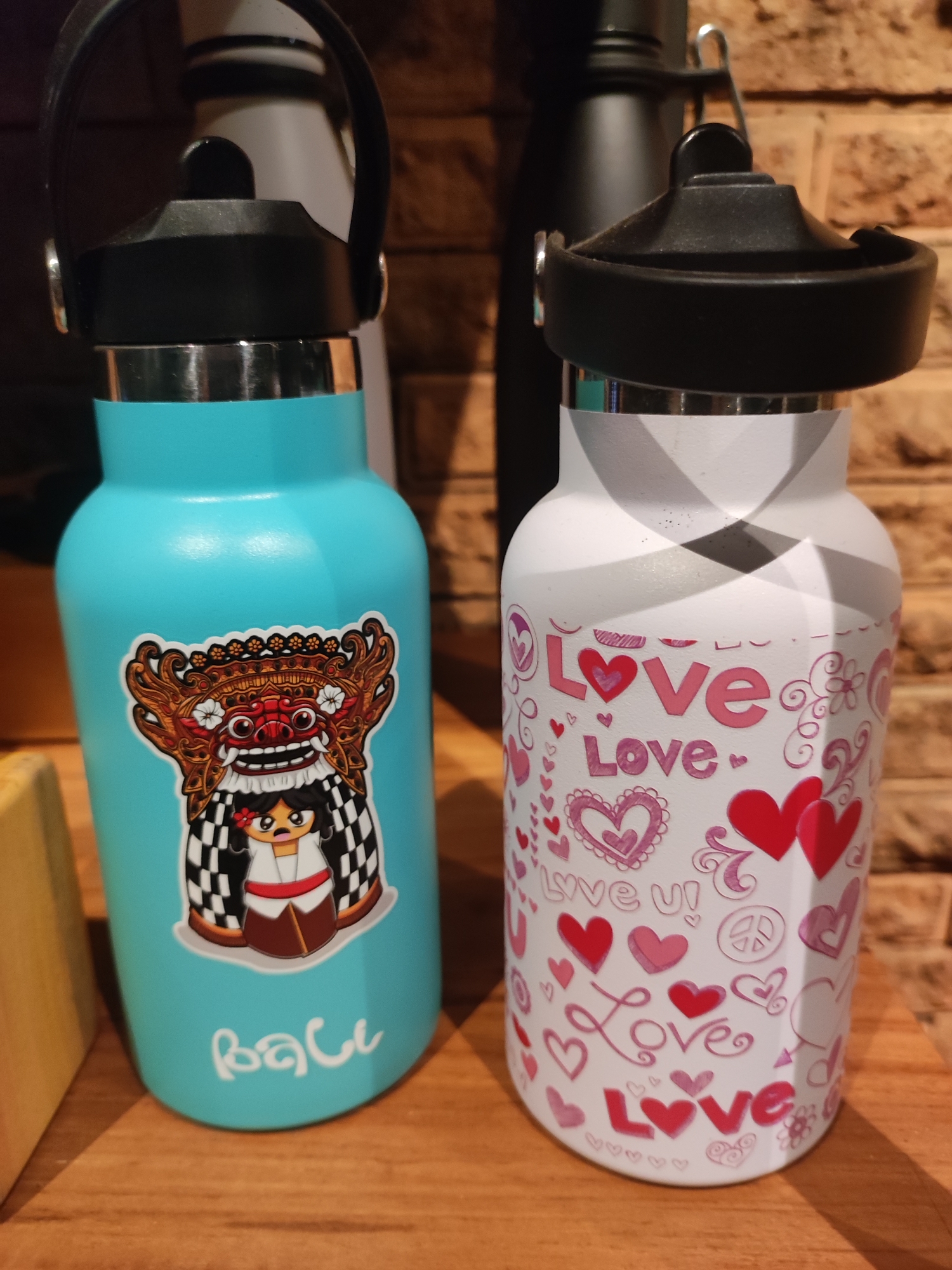 Two insulated water bottles are prominently displayed in an indoor setting on a polished wooden surface. The background features a blurred brown brick wall. The location is specified as the city of Mas, Indonesia. On the left, a teal-colored insulated water bottle stands with a black flip-top lid and a carrying handle. A multi-colored sticker on its front depicts a Balinese Barong mask above a cartoon figure in traditional Balinese attire, including a black and white checkered sarong. Below the sticker, the word "BaLi" is written in white script. On the right, a white insulated water bottle with a black flip-top lid is visible. Its surface is adorned with numerous pink and red heart motifs, alongside multiple instances of the word "Love" in varying fonts, and small peace symbols. Behind these two bottles, two additional out-of-focus bottles are partially visible; one is dark-colored (likely black), and the other appears light gray or white. A light-colored wooden object is partially visible on the far left of the frame.