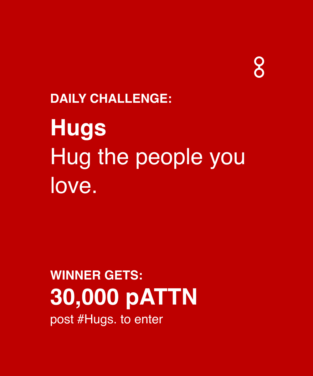 The image displays a daily challenge to hug loved ones. The color scheme is a solid red background with white text. Prominently featured are the words "DAILY CHALLENGE:" followed by "Hugs." Instructions state, "Hug the people you love." The incentive is "WINNER GETS: 30,000 pATTN," with instructions to "post #Hugs. to enter." In the upper right corner, there is a white number "8." The overall design is simple and aims to promote affection.