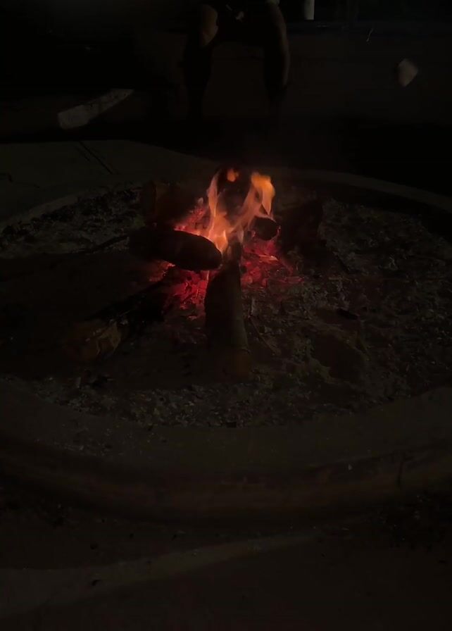 A video shows a small fire burning in a fire pit at night