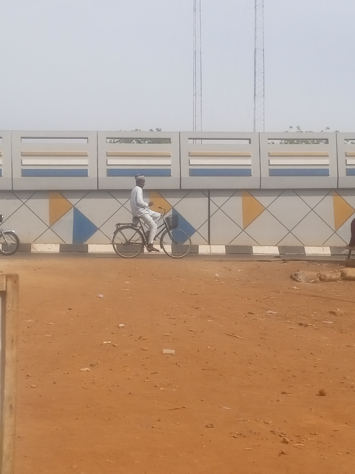 A man rides a bicycle in front of a patterned wall beneath power lines. The wall features gray rectangles with blue, white, and yellow horizontal stripes on top, and yellow and blue triangle designs below. A motorcycle is partly visible to the left, and the ground is dusty and brown. The overall scene appears to be an urban or semi-urban environment.