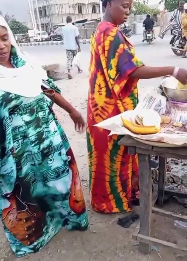 two women in an outdoor setting near a street. One woman is wearing a long, colorful dress and a black head covering and is standing behind a small wooden table. She appears to be cooking or serving food, as there is a metal pan on the table and food items. The other woman is wearing a patterned long dress and a white head covering and is standing nearby. There are other people and vehicles visible in the background, suggesting an urban environment. The ground appears to be dirt or gravel.