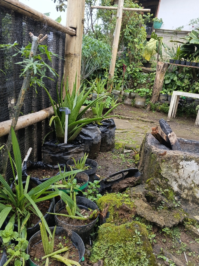 A small outdoor garden features various plants. Several aloe vera plants, some in black plastic bags and others in small pots, are prominent. Green vegetation, including palm-like plants and ground cover, fills the space. A bamboo structure and a concrete structure with moss growth are also visible. The area has a rustic, slightly overgrown appearance.