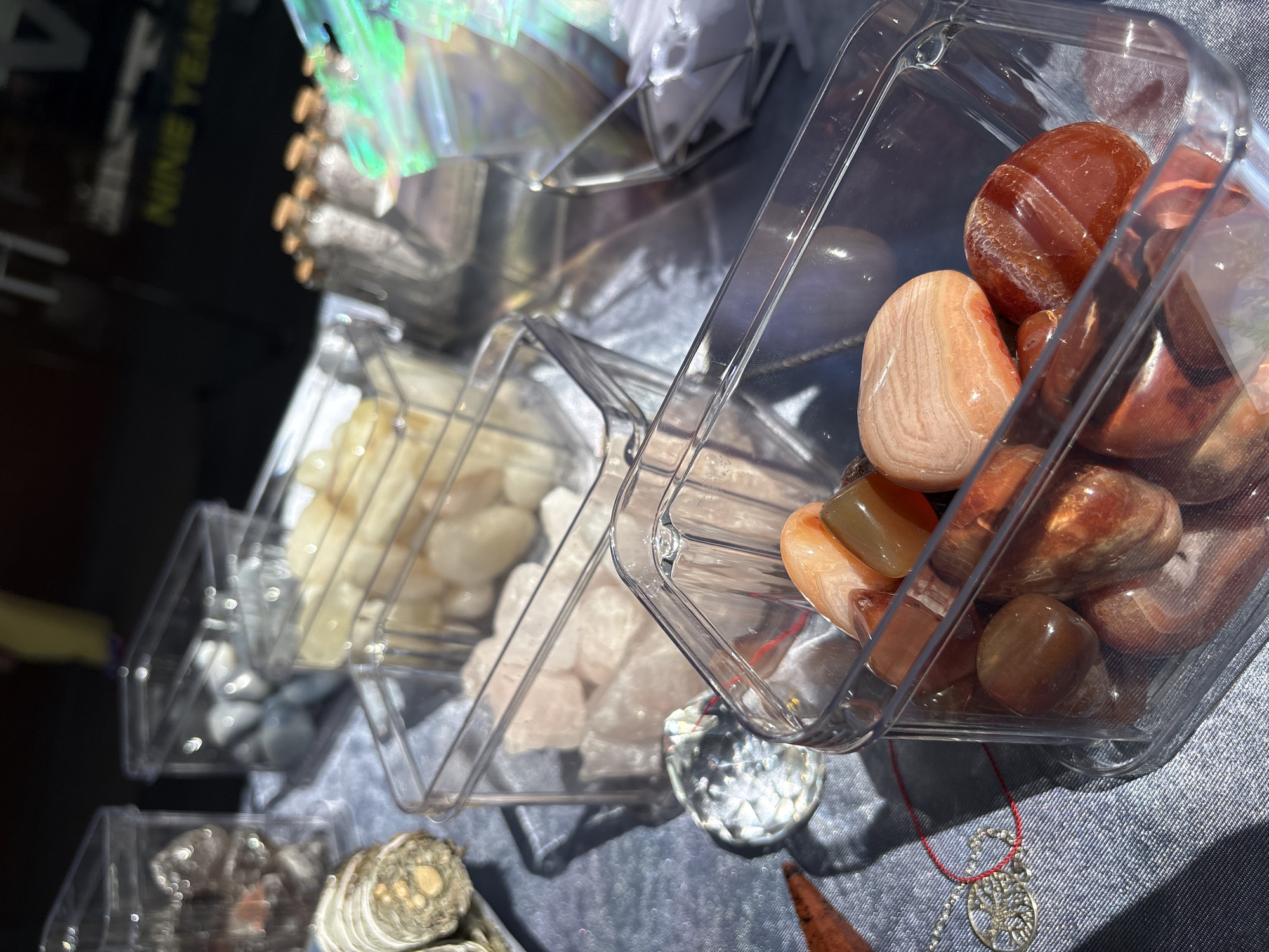 The image depicts a display of crystals and minerals, likely for sale. The setting is identifiable as San Andrés Cholula, Mexico, based on the presence of a "NINE YEAR" sign which corresponds to local business practices in the area. Several clear plastic containers hold tumbled stones of different types. The container closest to the viewer is filled with red/brown carnelian. Moving backwards, other containers hold white and pink crystals, possibly quartz. A faceted crystal sphere and a tree of life pendant on a red string rest amongst the containers. A dried plant pod is also visible in the lower left corner. The surface the items are resting on appears to be a silver-gray fabric. The arrangement suggests a retail setting, such as a market stall or metaphysical shop.