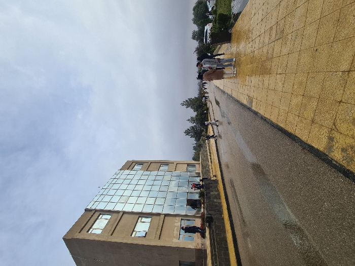 A modern building with mirrored windows stands beneath a cloudy sky. A wide, paved walkway with yellow tiles stretches into the distance, where small groups of people are walking. The walkway is bordered by green foliage on one side and the building on the other. A wet road runs alongside the building, reflecting the overcast sky. The scene conveys a sense of a campus or urban environment on a cool, possibly rainy, day.