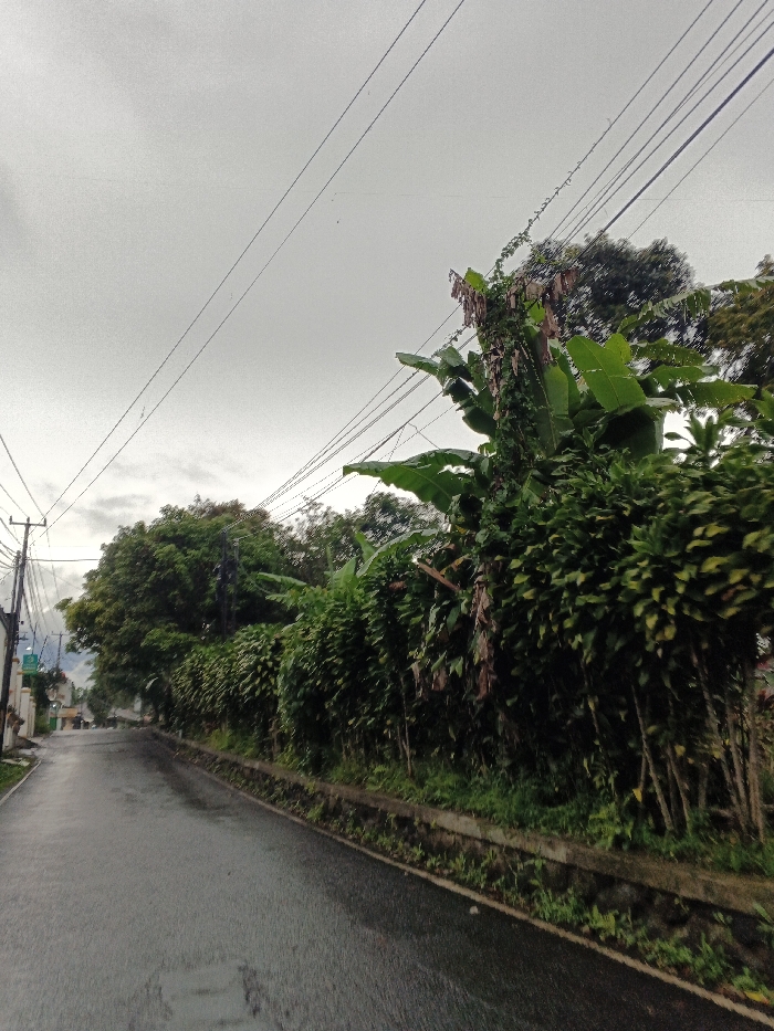 The image depicts a wet asphalt road in Sindangjaya, Indonesia, under an overcast, light grey sky. The road surface reflects ambient light, indicating damp conditions likely from recent rainfall, and extends into the distance, curving gently to the left. On the right side, a dense wall of tropical vegetation borders the road, separated by a concrete drainage ditch containing some overgrown grass. This vegetation comprises various green shrubs, some appearing as groomed hedges, and taller, large-leafed plants consistent with banana trees. A prominent vine heavily enshrouds a taller, possibly dead, plant structure within this foliage. On the left side of the road, a dark utility pole supports numerous overhead power lines that traverse the upper portion of the frame. Further down the road on the left, partially obscured residential or commercial structures are visible behind walls and additional trees, with a small green sign identifiable in the mid-ground. No individuals are present in the scene, and no specific actions or interactions are depicted.