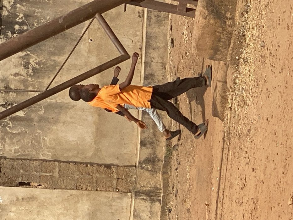 - "In Sabon Tasha, Nigeria, two young males are observed walking from left to right across an unpaved, reddish-brown dirt ground scattered with small stones and sparse dry vegetation" by FM-KthwF2, licensed under CC BY 4.0