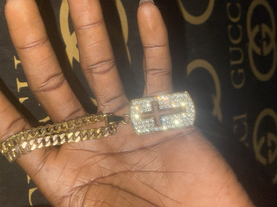 A close-up image, taken in Uturu, Nigeria, displays a dark-skinned human hand holding a gold-colored Cuban link chain. Attached to the chain is a rectangular pendant, also gold-toned, featuring a polished, raised cross design centrally. The cross is bordered by numerous small, clear, faceted stones that exhibit significant sparkle. The hand is positioned against a dark textile background, which features a repeating pattern including the word "GUCCI" and its interlocking "GG" logo in gold lettering.