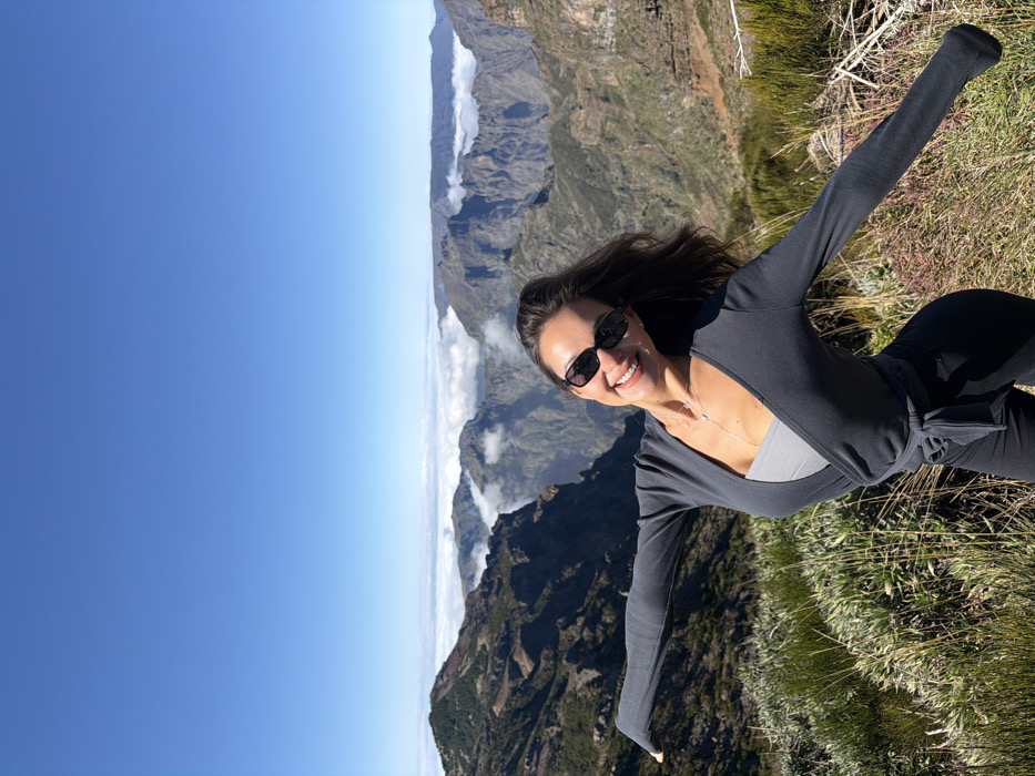 An adult female subject is centered in an outdoor, high-altitude setting, posing on a vegetated slope. She has dark hair, dark oval-framed sunglasses, and wears a dark charcoal grey long-sleeved wrap-style top tied at the waist, layered over a light grey camisole, and dark trousers. She exhibits a wide smile, with her head tilted slightly to her left (viewer's right), and both arms extended horizontally outwards, hands out of frame. The foreground features low-lying scrub vegetation and sparse dry grasses. Behind the subject, a deep valley gives way to multiple layers of rugged, dark mountain peaks and ridges, some with sparse green vegetation. A dense layer of white stratocumulus clouds forms a "sea of clouds" below the higher peaks in the mid-distance, extending towards the horizon. The upper portion of the frame is a clear, bright blue sky. Strong, direct sunlight illuminates the scene. The landscape is characteristic of the mountainous interior of Madeira Island, specifically within the municipality of Santana, Portugal.