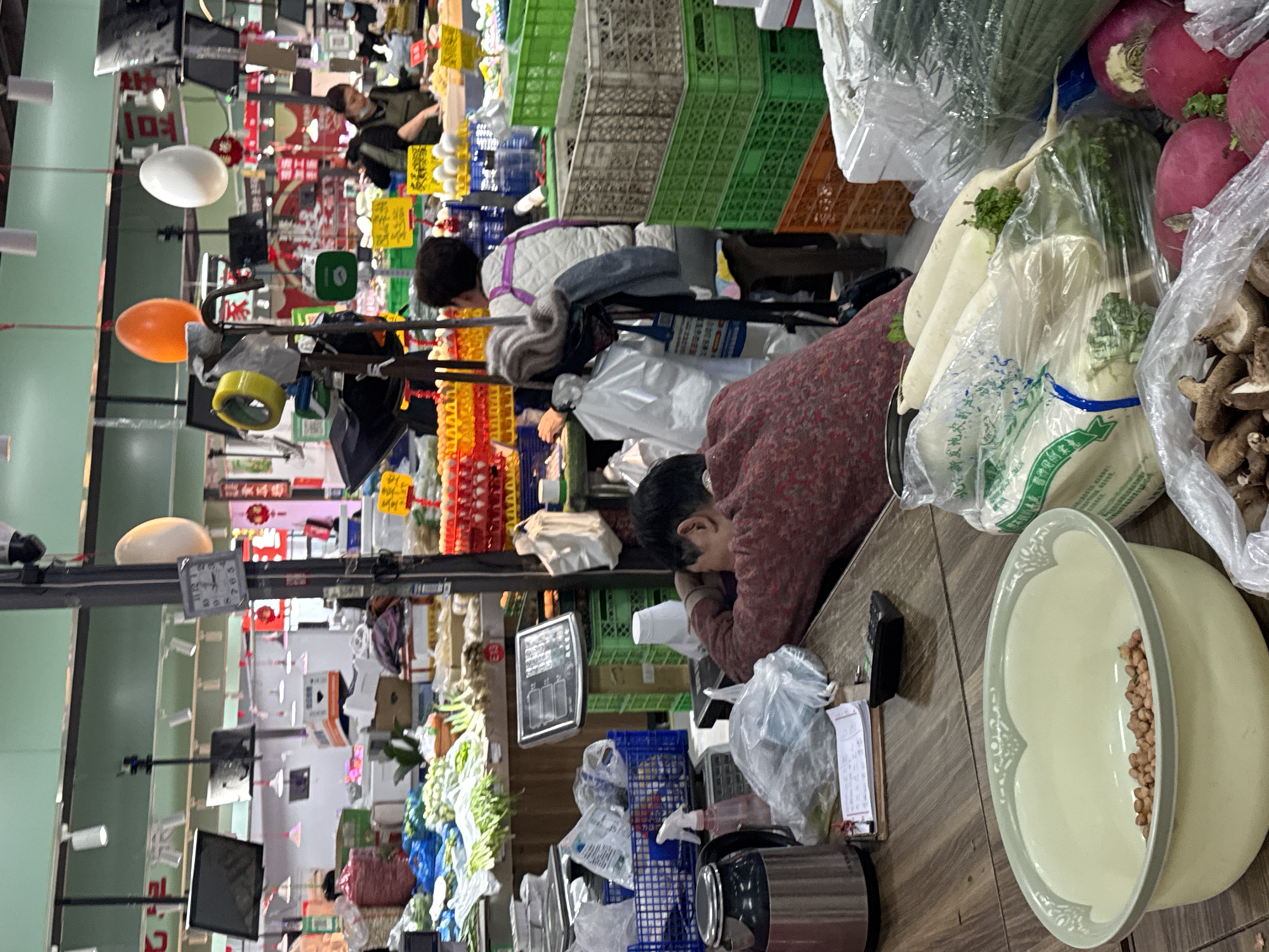 interior of what appears to be a market in Guta, China. Several people are present, including at least two vendors behind stands displaying a variety of goods. One vendor is seen resting their head on their arm. The stands hold fresh produce like daikon radishes, red radishes, mushrooms, and green vegetables that are stored in plastic bags. Other goods include eggs, placed in colorful, stacked crates and other items. In the foreground, a light-colored bowl containing what appear to be peanuts is visible. Various tools and equipment associated with market operations are also present, including scales, price tags, and plastic baskets. Artificial lighting fixtures and a clock hang from the ceiling, with digital signs visible in the background.