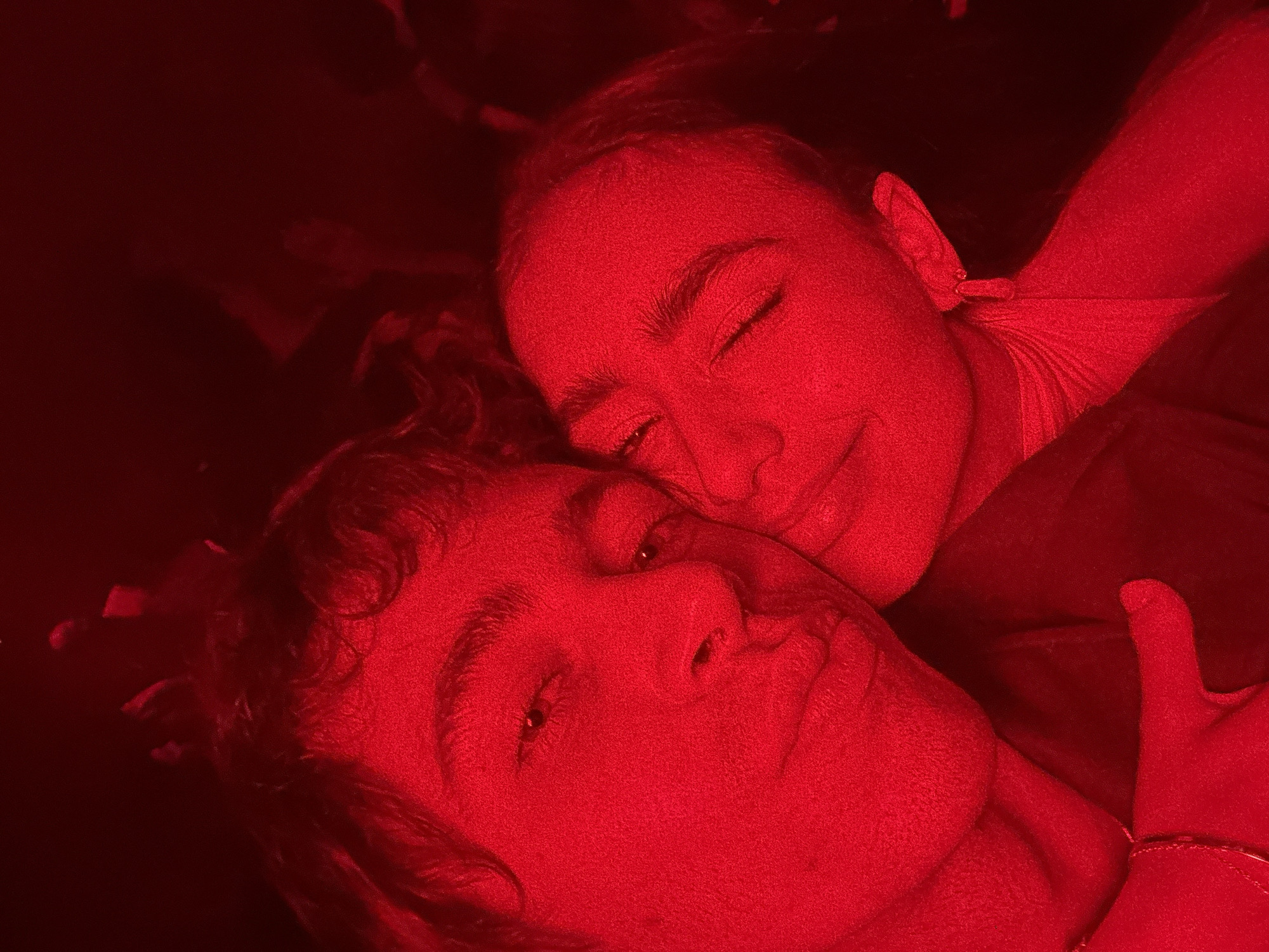 - "The image displays a close-up portrait of two individuals, a male and a female, in an intimate embrace, bathed entirely in intense red lighting" by FM-pqxts1, licensed under CC BY 4.0