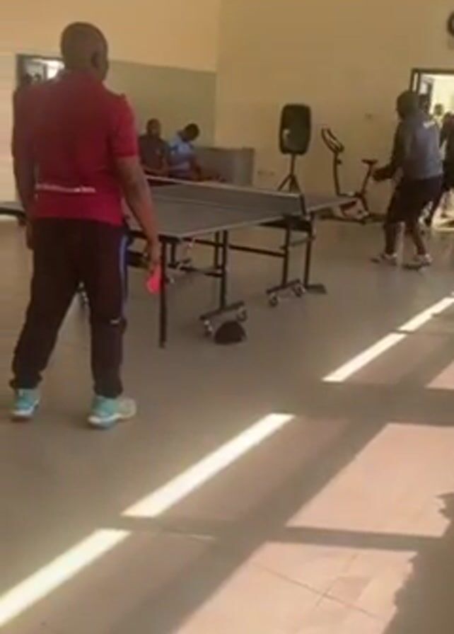 Two men are playing table tennis in a large room with light yellow walls and a light beige tiled floor. Sunlight streams in from a window, casting long shadows across the floor. One man is wearing a maroon shirt and dark athletic pants. The other man is wearing a dark shirt and shorts. There is a black table tennis table in the center of the room. Behind the table are two men sitting on a bench. A speaker and an exercise bike are also in the room. Another man stands near the door.