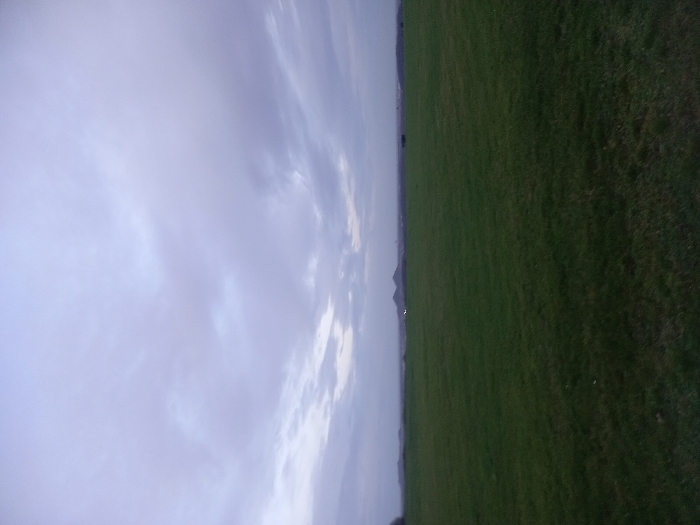 A vast green field covers the right half of the image. Overcast skies fill the left, with subtle clouds. The horizon line is nearly centered. A small, distant hill is visible near the horizon. A few scattered trees are also visible along the horizon, but they are dwarfed by the vast field and sky.