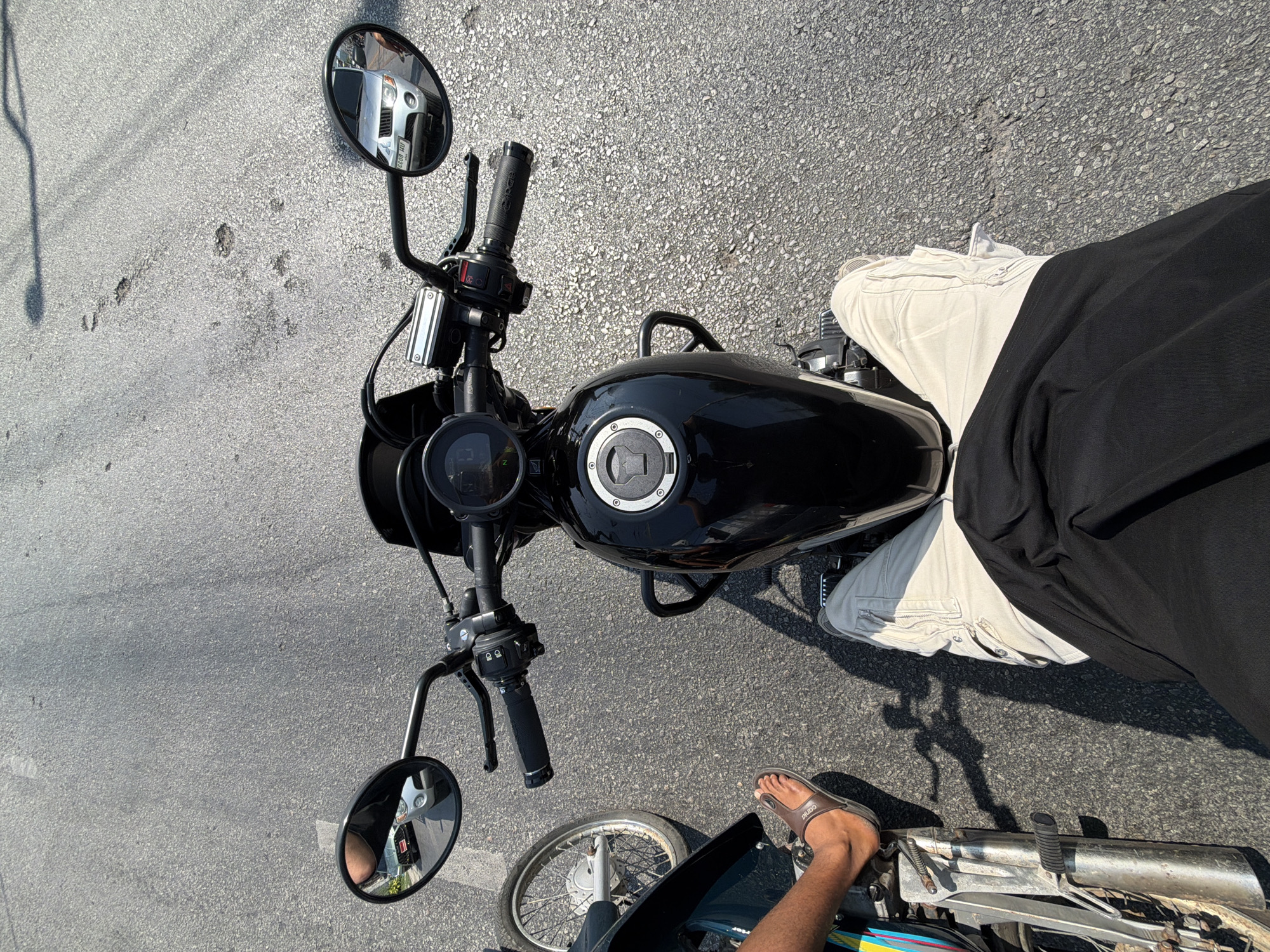 An overhead view captures a scene on an asphalt road in Wichit, Thailand, from the perspective of a person seated on a black motorcycle