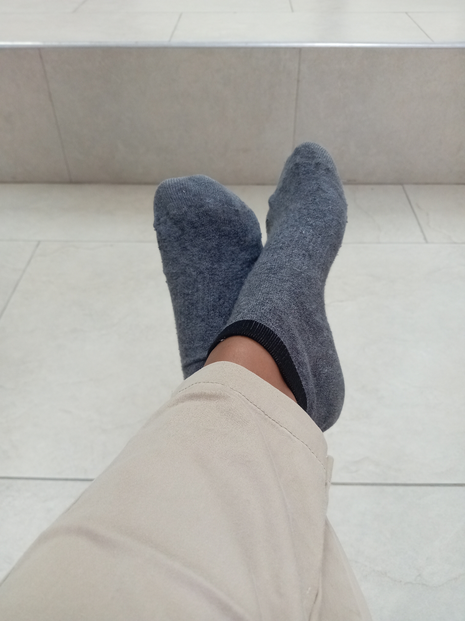 A photograph shows a person's legs and feet resting indoors. The person is wearing light beige pants and gray socks with black trim. Their ankles are crossed. The background consists of light-colored tiled flooring and a section of wall covered in similar tiles. The location is in the city of Unknown, Unknown.