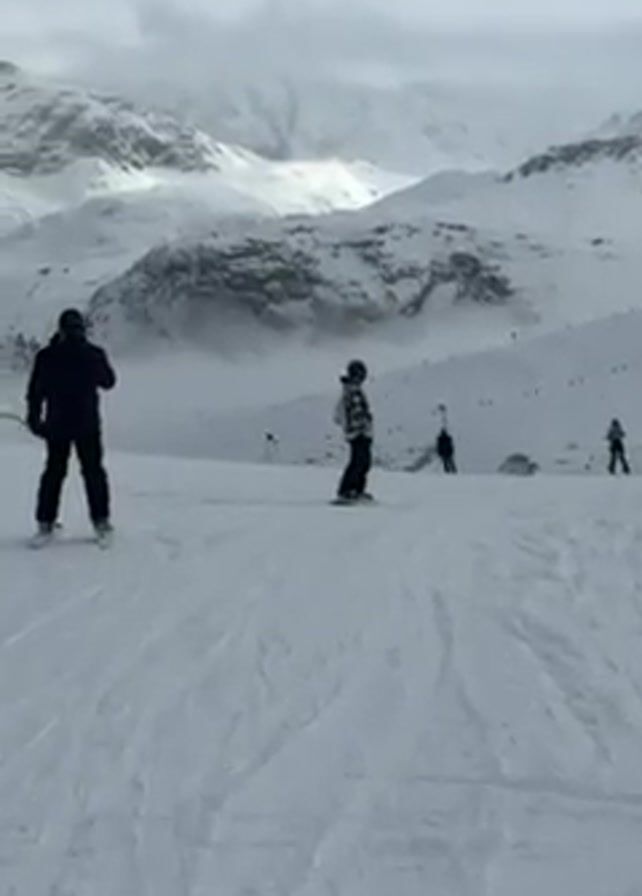 snowy mountain landscape with several people skiing and snowboarding. The sky is overcast and the mountains in the background are partially obscured by clouds. A person in dark clothing is standing in the foreground with skis and poles, and other skiers and snowboarders are visible further down the slope. The ground is covered in snow with tracks from previous skiers.