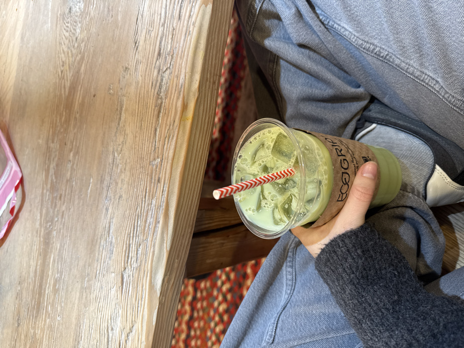 - "An iced green matcha latte is held in someone's hand while seated" by FM-8uZDn2, licensed under CC BY 4.0