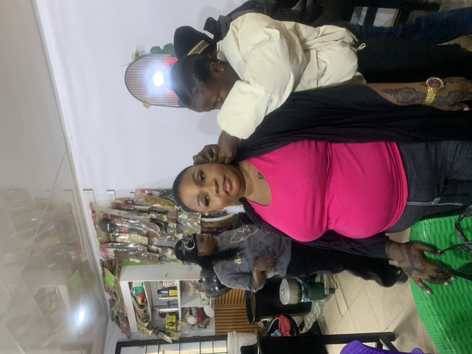 In a bright indoor space, a woman in a pink top and black shawl is being styled. A younger woman, wearing a white jacket and black hat, works on her hair. In the background, another woman with dark hair sits, wearing a grey shirt. A shelf packed with hair extensions and beauty products is visible, along with a floor fan, contributing to the bustling atmosphere.