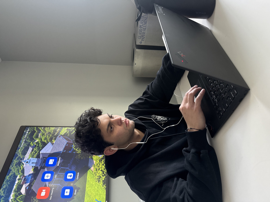 The image captures a young adult male seated at a white desk, actively using a black Lenovo ThinkPad laptop. He wears a black hooded sweatshirt with a white graphic design and white wired earbuds. A dark bracelet adorns his left wrist. His gaze is directed toward the laptop screen, with his hands positioned over the keyboard and trackpad. To his right, a black Yeti water bottle with a silver lid rests on the desk. Behind the individual, a large wall-mounted flat-panel display shows the Zoom interface, featuring icons for "New Meeting," "Join," "Whiteboard," "Share," and "Contacts." The background image on this screen is an aerial view of Brandeis University in Waltham, Massachusetts, United States, highlighting a brick building with a prominent clock tower amidst green foliage. To the right, two grey, perforated recycling/waste bins are partially visible, one explicitly labeled for "GLASS-PLASTIC PAPER-ALUMINUM." The room's walls are painted a plain light grey.