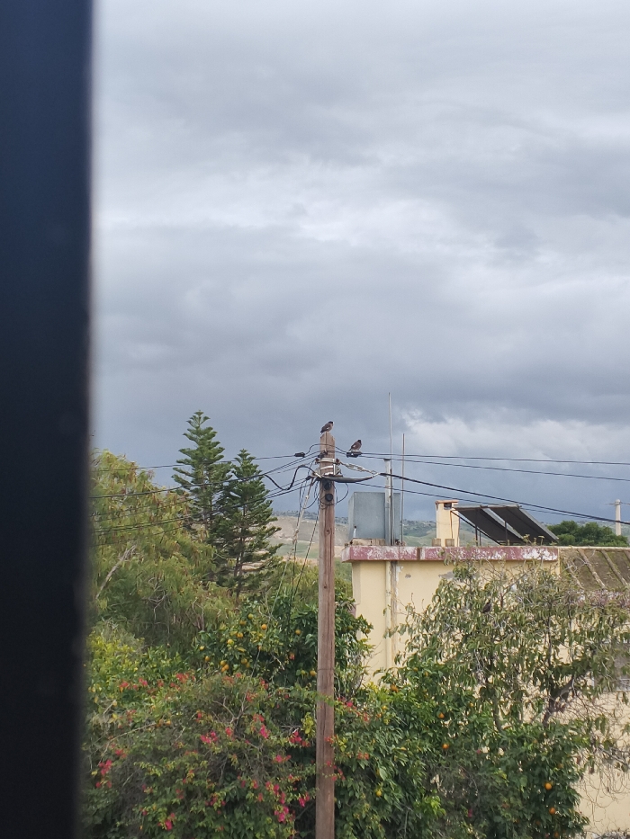 The image depicts an outdoor scene in الشيخ حسين قرية, Jordan, under an overcast sky. A dark, vertical frame element occupies the leftmost portion of the foreground. Centrally, a wooden utility pole with multiple power lines and associated equipment is prominent. Two dark-plumaged birds are perched on the upper section of this pole and an adjacent wire. To the left of the pole, dense green vegetation includes several tall, conical evergreen trees and various leafy shrubs. To the right, a light-colored building with a flat roof features a chimney, two solar water heaters, and an antenna. The midground is dominated by lush green foliage, including trees bearing yellow-orange fruits and bushes with pink-red blossoms. In the background, rolling hills extend under the cloudy, grey sky. No human subjects are visible.