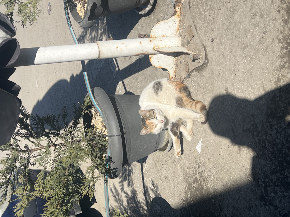 A calico cat is situated on a concrete surface in an outdoor area of Ruse, Bulgaria. The cat, displaying white fur with distinct patches of orange/brown and dark grey/black, and possessing yellowish-green eyes, is in a splayed sitting posture, with its left front paw extended forward and its right hind leg extended laterally. It gazes directly ahead. To the cat's immediate left stands a dark grey plastic planter containing a green coniferous shrub, its soil covered with light-colored pebbles. A black zip tie secures the planter's upper rim. A thin light blue hose crosses the pavement behind the cat, passing near the planter. To the cat's right, a white metal pole with a visibly rusted, ornate metal base rises vertically from the ground. The scene is illuminated by strong sunlight, casting sharp shadows, notably a large human-shaped shadow extending from the immediate foreground towards the cat. The concrete ground exhibits variations in texture and some staining.