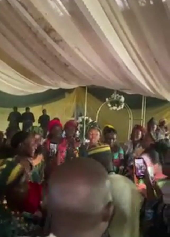 group of people dancing under a white and yellow tent. The people are dressed in colorful traditional clothing, and many are filming or taking pictures with their phones. The focus is on a woman in the center of the group who is smiling and dancing. There are a few security guards at the back. The tent is decorated with a floral arch.