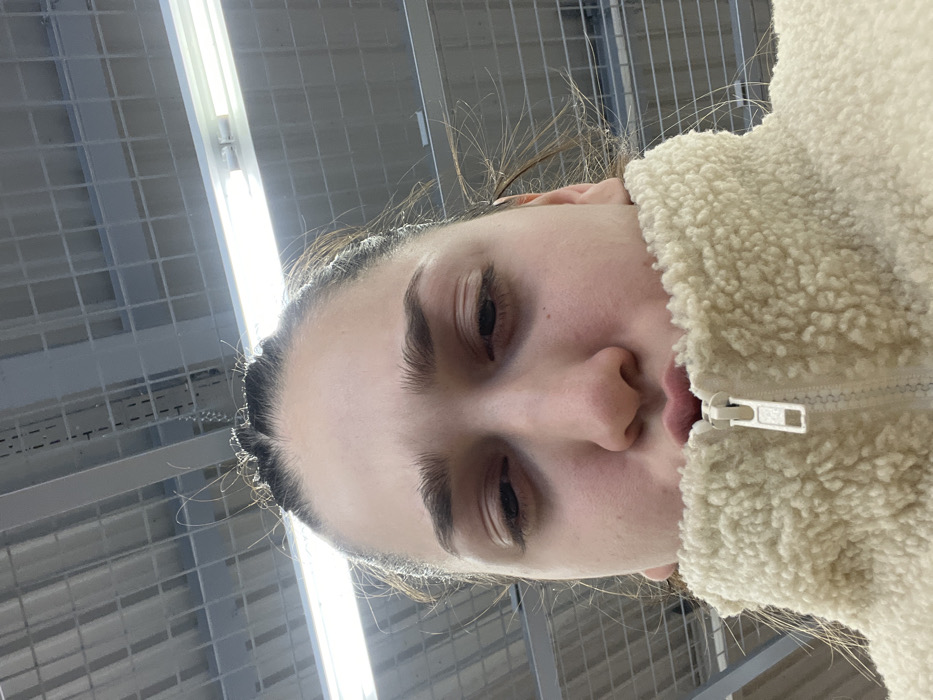 The image displays a close-up, low-angle, indoor portrait of a single female subject. The scene is situated within Lampertheim, France. The subject is depicted from below eye level, looking downwards with her eyes partially closed. Her dark hair is pulled back, with several wisps visible around her forehead. Her dark eyebrows are prominent. The lower portion of her face, from the nose downwards, is partially obscured by the high collar of a light-colored, possibly off-white or cream, fuzzy jacket, resembling sherpa or fleece material. A white zipper pull is visible at the center of the jacket's collar, positioned below her chin. The upper background features a brightly lit indoor ceiling with a grid-patterned structure and multiple linear fluorescent light fixtures, indicative of a large commercial or industrial interior. No other individuals or specific objects are present within the frame.