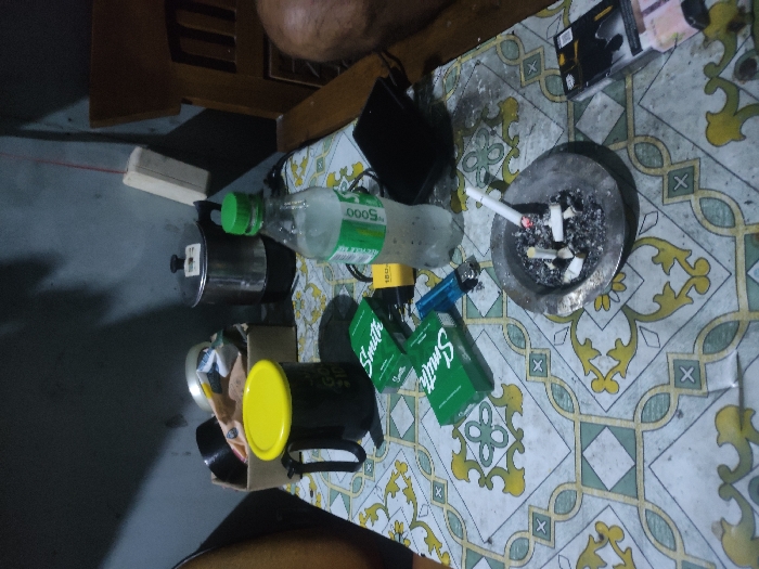 An indoor scene, captured in the city of Bogor, Indonesia, shows a close-up view of a table covered with a light-colored tablecloth patterned with repeating green, yellow, and grey geometric designs. On the table, a heavily used, oval-shaped metal ashtray contains multiple cigarette butts and ash, with one cigarette actively burning, indicated by an orange tip. To the left of the ashtray, two green packs of "Smith" brand cigarettes are present, one appearing open. A blue disposable lighter lies near the cigarette packs. Further right, a clear plastic bottle with a green cap, partially filled with a clear liquid, shows condensation on its exterior. Next to the bottle is a small yellow electronic device, possibly a power bank, connected by a black cable, and a black smartphone lying face down. A black mug with a bright yellow lid is positioned behind the cigarette packs and lighter. A brown cardboard box filled with various items, including rolls of black and white tape, stands behind the mug. Behind the box, a small, silver and black electric kettle or rice cooker is visible. The background consists of a plain, light-colored wall with a white rectangular power outlet or switch connected by a red wire. Partial views of two individuals are present at the edges of the frame: an arm or leg is visible on the far left, and a leg with some hair is visible on the far right, next to a portion of a wooden chair.