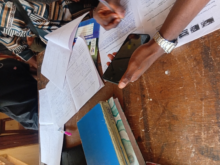 The image displays an indoor scene in Awka, Nigeria, centered on a worn wooden desk surface