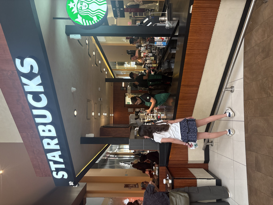 Inside a Starbucks, baristas in green aprons work behind the counter, preparing drinks. A young girl in a white shirt and blue skirt stands to the side, facing the counter. Customers sit at tables, some holding coffee cups. The Starbucks logo is prominently displayed. The space features a combination of modern and warm wood accents. Lighting is provided by recessed ceiling lights.