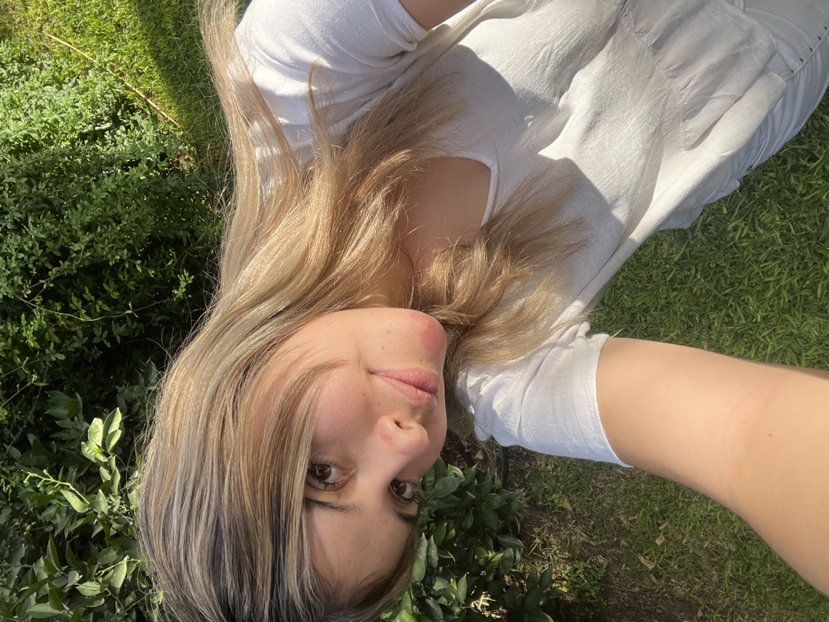 A woman with blonde and gray-streaked hair lies on green grass, possibly in a yard or park. She wears a white linen shirt or dress. Her face is turned towards the camera, showing brown eyes and a hint of a smile. Sunlight dapples her skin and the surrounding foliage. The angle suggests the photo was taken from an above-eye-level perspective, potentially a selfie.