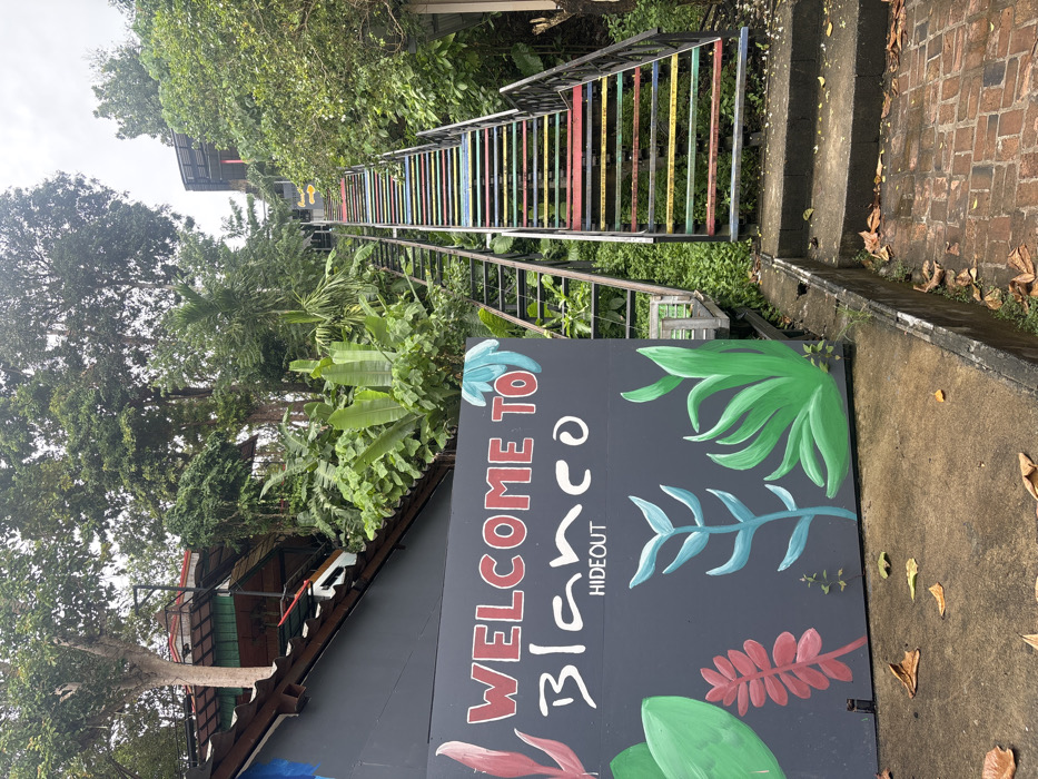 The image captures the entrance to "Blanco Hideout" in Ao Nang, Thailand, on an overcast day
