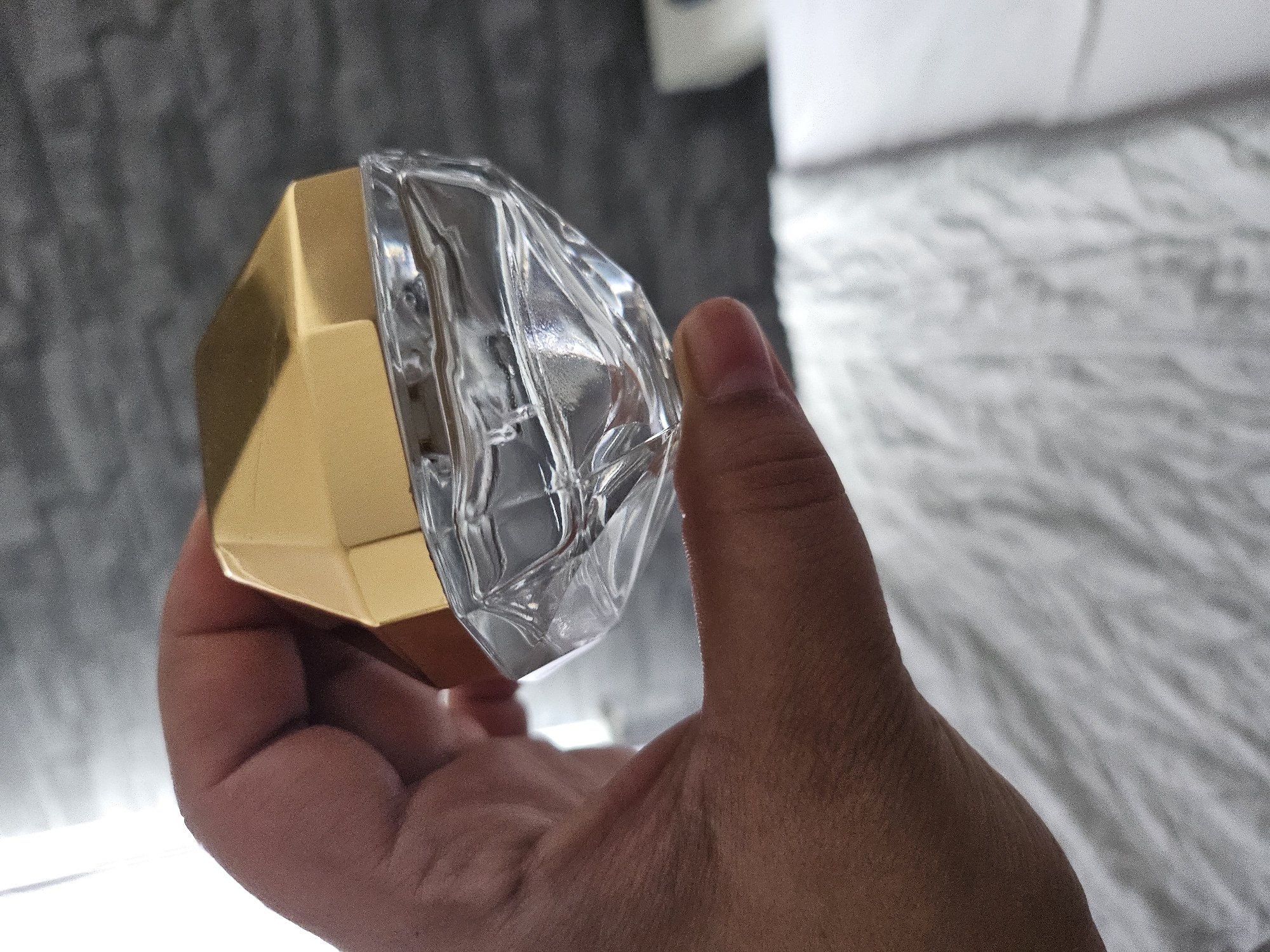 - "An adult human hand, exhibiting a medium skin tone, is centrally positioned, holding a clear, multi-faceted glass bottle with an angular gold-colored cap" by FM-DolI92, licensed under CC BY 4.0