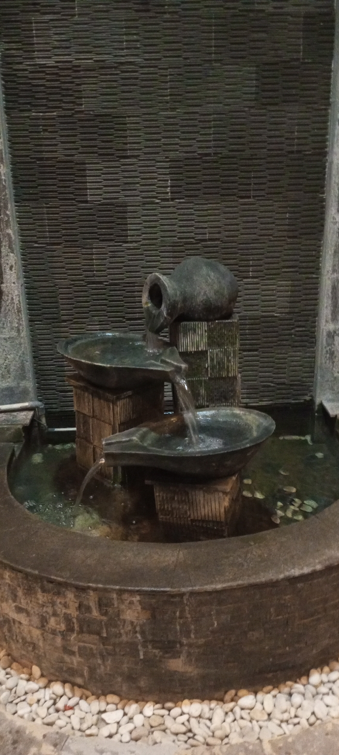 This image depicts a multi-tiered water fountain, located in Pacet, Indonesia. The central feature is a tiered water fountain constructed from dark, aged stone or ceramic components. At the uppermost level, a dark, horizontally oriented pot or jar rests on a textured base, emitting a stream of water from its mouth. This water cascades into a lower, dark, shallow, boat-shaped basin, which in turn overflows into a second identical basin positioned below it. From the second basin, water flows into a circular, dark-colored main basin at the base. The main basin contains water, exhibiting ripples and reflections, with several small, light-colored objects (possibly petals or leaves) floating on its surface. The fountain structure is supported by stacked, textured block bases. Behind the fountain, a dark, textured wall with horizontal striping serves as a backdrop, flanked by two vertical pillars of similar material. The area immediately surrounding the circular basin's exterior is covered with white and light-colored pebbles. No individuals or animals are present, and no overt actions beyond the continuous flow of water are observed.