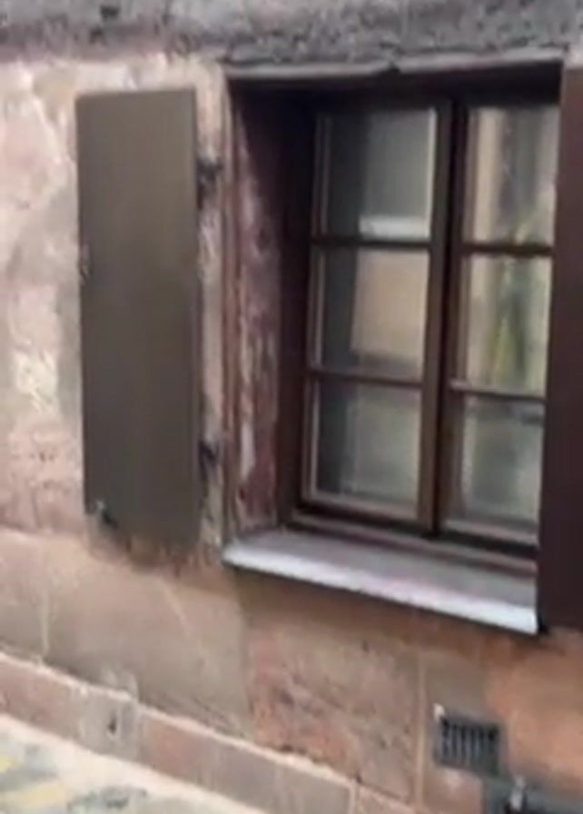 exterior of a building. The bottom portion of the building is constructed of reddish-brown stone, while the upper portion has a timber frame with white infill panels. The building has a window with dark wooden shutters, one of which is partially open. A cobblestone street is visible in the foreground.