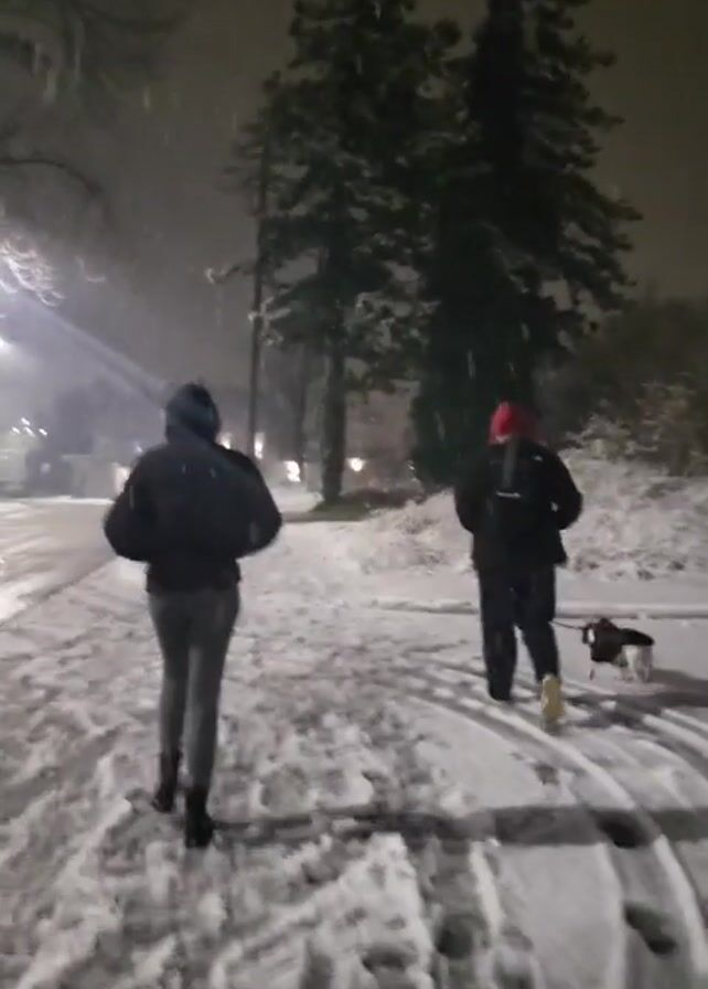 Two individuals, one wearing a dark jacket and light-colored pants and the other wearing a dark jacket and a red hat, are walking in the snow with a small dog on a leash. The street and surrounding areas are covered in snow, and the scene is lit by streetlights. It appears to be nighttime and snowing heavily.