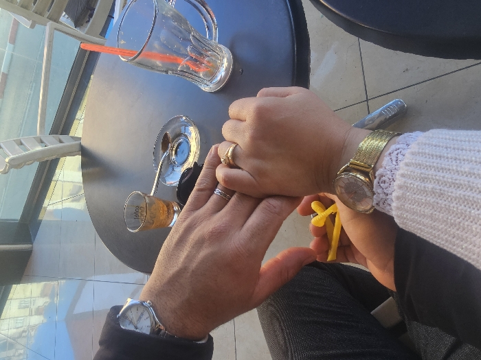 The image depicts two individuals seated at a dark, circular table within a cafe in Azrou, Morocco. The upper portion of a male's left hand, adorned with a silver ring on the ring finger and a silver-toned wristwatch with a white dial and Roman numerals on the wrist, rests gently upon the top of a female's left hand. The female's hand displays a gold ring on the ring finger and a gold-toned wristwatch with a mesh strap and patterned face on the wrist; her wrist is covered by a white knitted sweater with a lace cuff. The female's fingers are clasped around a small, yellow, irregularly shaped plastic object. On the table, an empty clear glass mug containing an orange plastic straw is situated near a small glass cup holding an amber liquid, which rests on a silver saucer with a small spoon. The glass cup has partially visible text printed on its side. A dark, indistinct object, possibly a phone or wallet, lies on the table between the cup and the clasped hands. The background features large glass windows reflecting exterior urban buildings and the sky. White, slatted chairs are visible through the window, indicating either an outdoor seating area or an indoor space with a view. The floor is composed of light-colored tiles.