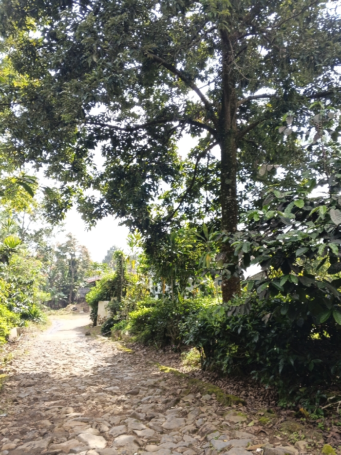 A rocky road winds through a lush green landscape. A large tree dominates the scene, its leafy canopy casting shadows on the path. Buildings are visible through the dense vegetation. A variety of plants and trees create a natural tunnel effect along the roadside. The sunlight filters through the leaves, creating a dappled effect on the ground.