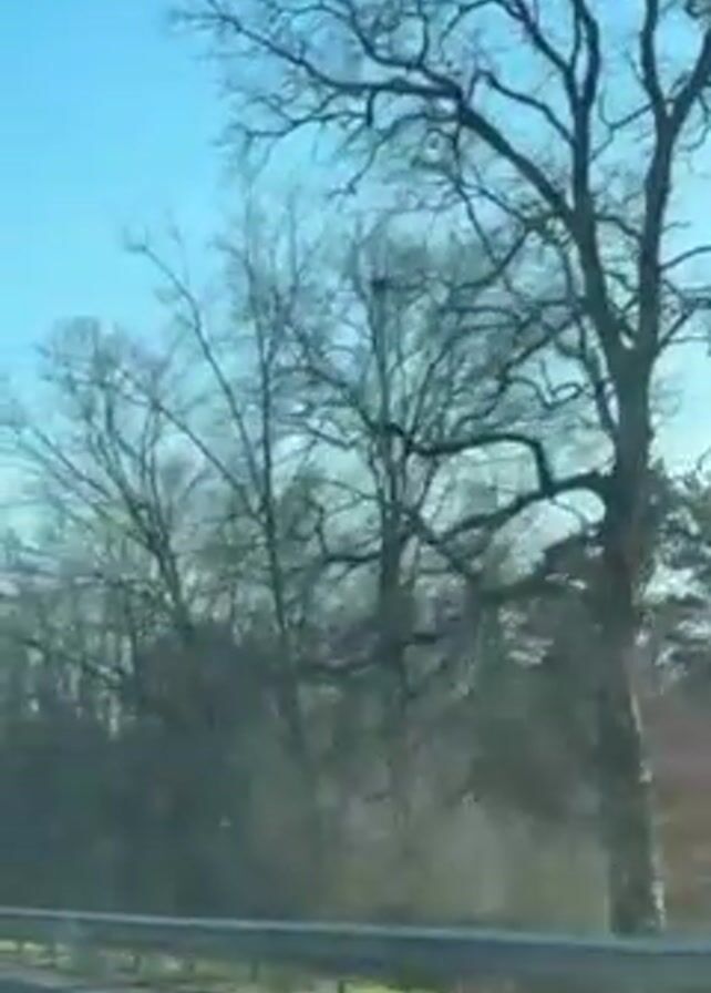 car driving on a highway. The sky is clear and blue. The road is black asphalt with yellow lines. On the side of the road are trees without leaves. A grey metal guard rail lines the side of the road. Other cars can be seen in the distance.